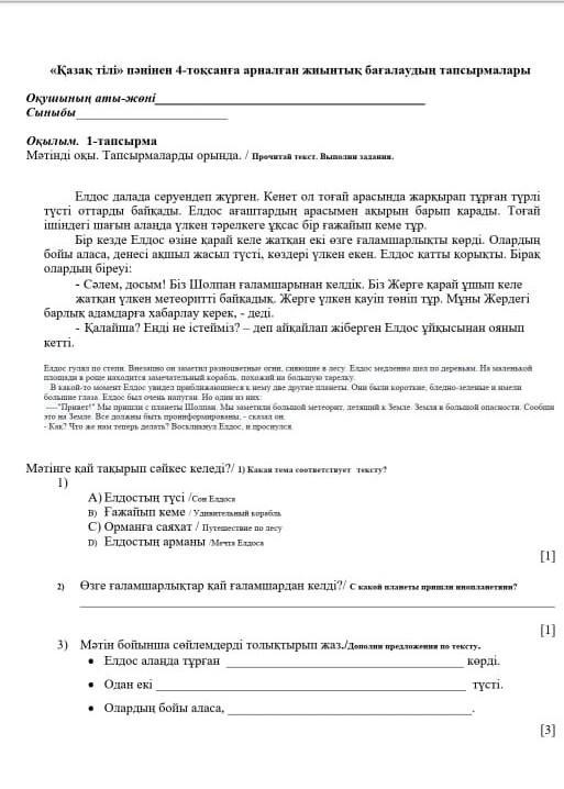 1)А 2)шолпан 3)улкен тарелкеге уксас гажайып кемени корди ,одан еки озге галамшарлыкты корди,денеси акшыл жасыл тусти,коздери улкен.