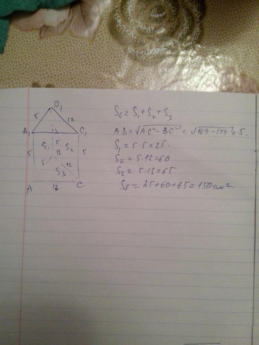 1.Основание прямой призмы – прямоугольный треугольник с катетом 12 см и гипотенузой 13 см. Найдите полную поверхность призмы, если боковая грань, содержащая неизвестный катет основания, является квадратом.