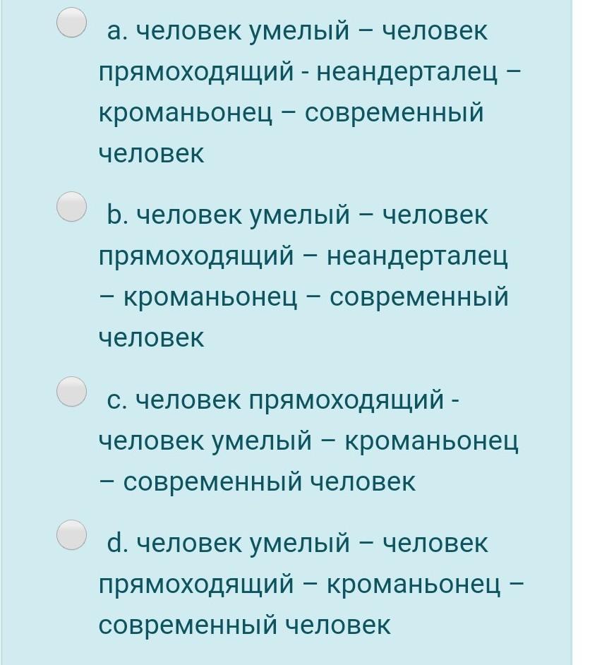 отметьте линию эволюции человека в которой записана наиболее правильная прямая последовательность человеческих видов