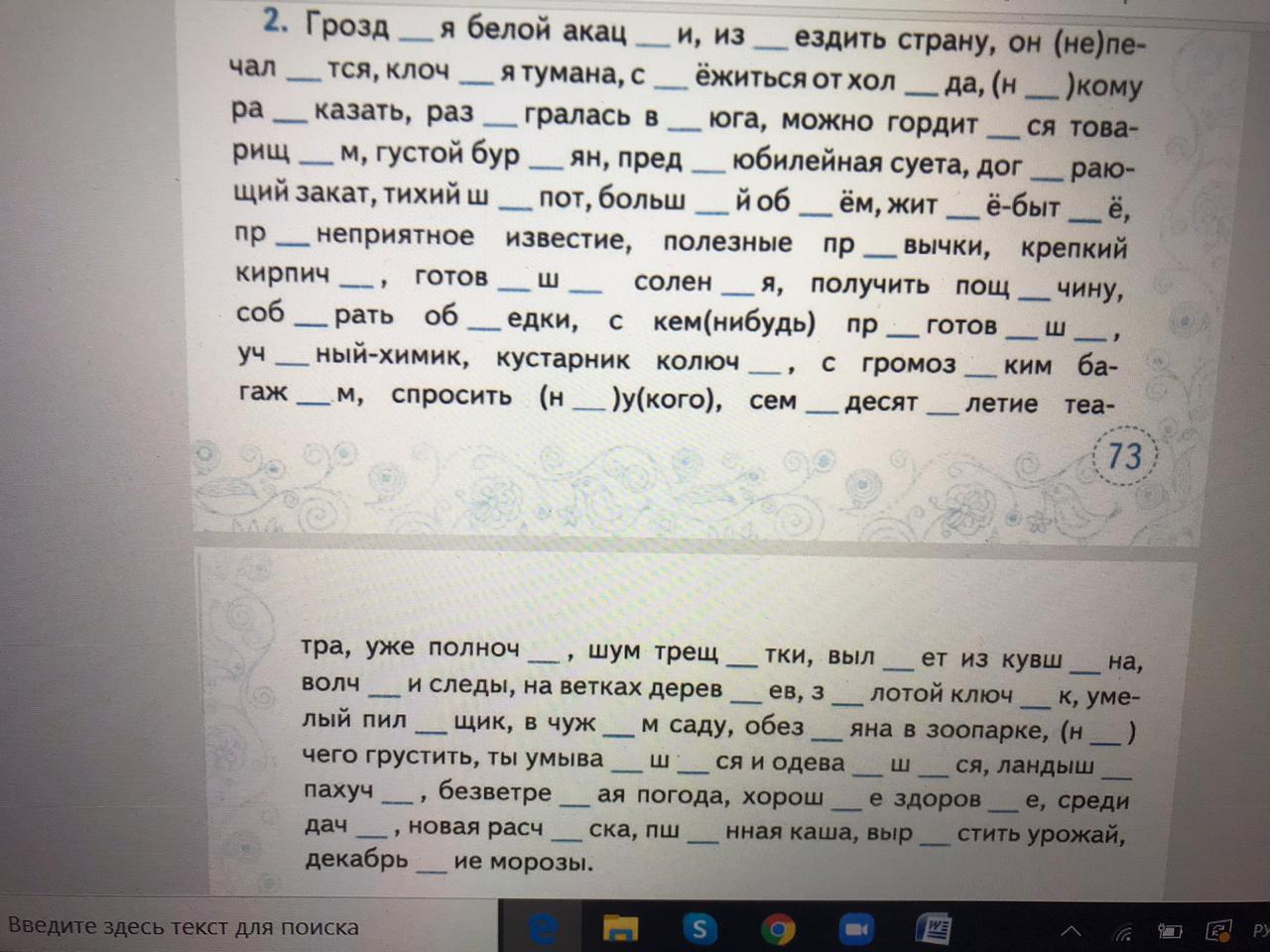 гроздья белой акации, изъездить страну, он не печалится, клочья тумана, съёжиться от холода, некому рассказать, разыгралась вьюга, можно гордиться товарищем, густой бурьян, предъюбилейная суета, догорающий закат, тихий шёпот, большой объём, житьё - бытьё, пренеприятное известие, полезные привычки, крепкий кирпич, готовишь соленья, получить пощёчину, собирать объедки, с кем-нибудь приготовишь, учёный-химик, кустарник колюч, с громоздким багажом, спросить не у кого, семидесятилетие театра, уже полночь, шум трещётки, выльет из кувшина, волчьи следы, на ветках деревьев, золотой ключик, умелый пильщик, в чужом саду, обезьяна в зоопарке, нечего грустить, ты умываешься и одеваешься, ландыш пахуч, безветренная погода, хорошее здоровье, среди дач, новая расчёска, пшённая каша, вырастить урожай, декабрьские морозы.