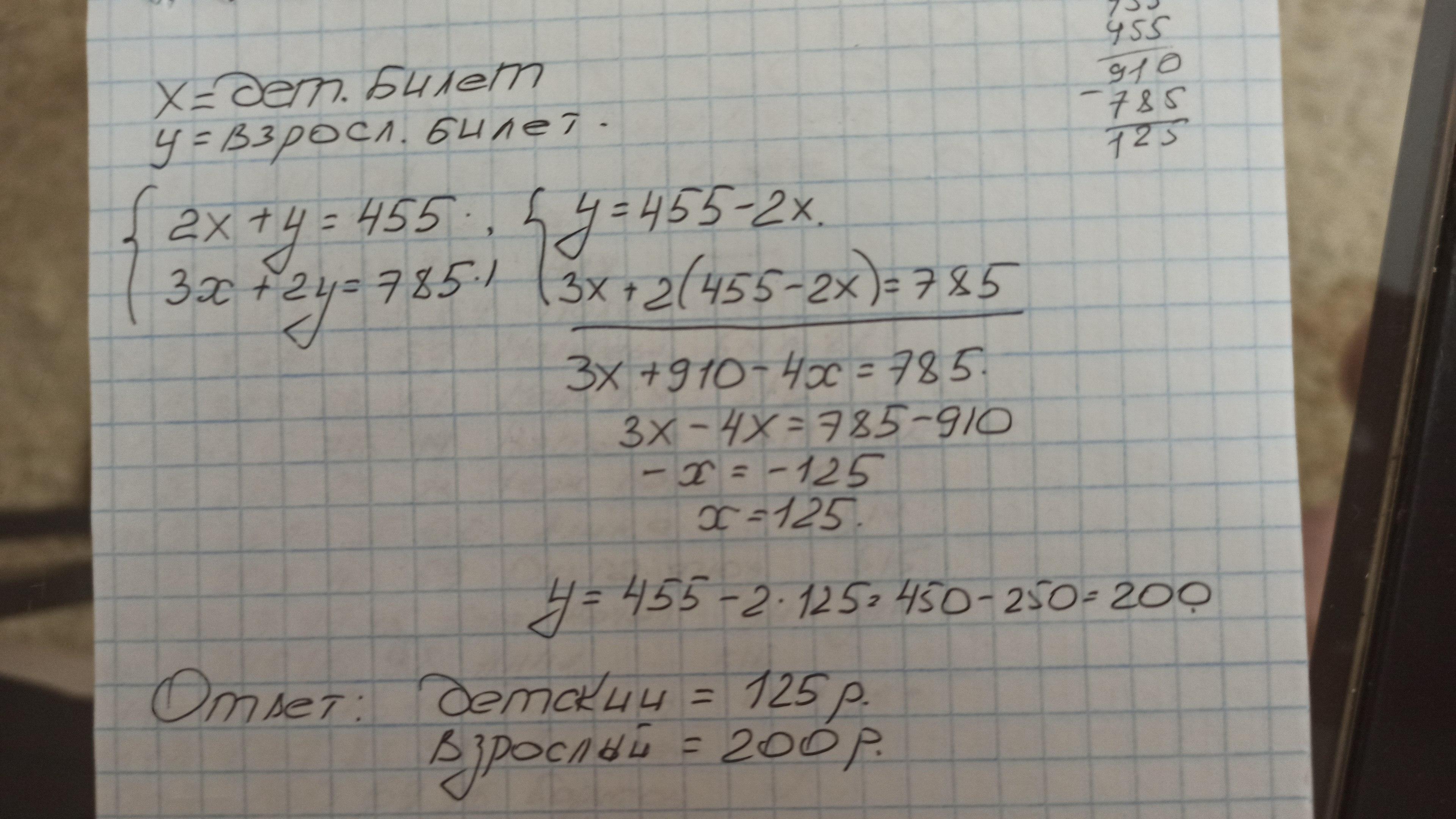 Две семьи отправились на детский утренник. Первая семья купила два детских билета и один взрослый и всего заплатила 445 рублей. Вторая семья купила три детских билета и два взрослых и всего заплатила 785 рублей. Сколько стоит один детский билет и сколько стоит один взрослый билет?