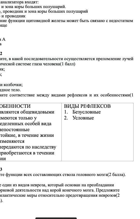 Страницы Задание 1 Выберите 1 правильный ответ(5 баллов): 1. За координацию движений отвечает а) мозжечок 6) продолговатый мозг в) промежуточный мозг г) средний мозг 2. Барабанная перепонка находится на границе между средним и внутренним ухом б) между наковальней и стремечком в) между улиткой и всстибулярным аппаратом )на границе между наружным и средним ухом 3. Биологические катализаторы, под действием которых происходит расщепление пищи,-это: а) витамины б) гормоны в) ферменты г) субстраты 4. Вестибулярный аппарат расположен в а) внутреннем ухе б) наружном ухе в) слуховой трубе г) среднем ухс 5. Зрительная зона расположена в доле больших полушарий. А) височной б) затылочной в) лобной г) теменной Нервные импульсы передаются от органов чувств в мозг по а) двигательным нейронам3; б) вставочным нейронам; в) чувствительным нейронам3; г) коротким отросткам двигательных нейронов. 7. Произвольные движения человека обеспечивают а) мозжечок и промсжуточный мозг; б) ередний и спинной мозг в) продолговатый мозг и мост; г) большие полушария переднего мозга. 8. Большой вклад в учение о высшей нервной деятельности внес: а) И.И. Мечников; б) И.П. Павлов; в) Луи Пастер; г) Н.А. Семашко Страниц 2 Страницы 9. В состав анализатора входят: а) рецеттор и зона коры больших полушарий. б) рецептор, проводник и зона коры больших полушарий в) рецептор и проводник 10. Нарушение функции щитовидной железы может быть связано с недостатком в пище а) йода б) хлора в) витамина А. г) углеводов Задание 2 11. Установите, в какой последовательности осуществляется преломление лучей света в оптической системе глаза человека(1 балл) А) хрусталик; Б) роговица; В) зрачок; Г) палочки и колбочки; Д) стекловидное тело. 12. Установите соответствие между видами рефлексов и их особенностями(1 балл). ОСОБЕННОСТИ А) являются общевидовыми Б) имеются только у ВИДЫ РЕФЛЕКСОВ 1. Безусловные 2. Условные определенных особей вида В) непостоянные Г) стойкие, в течение жизни не изменяются Д) передаются по наследству E) приобретаются в течении жизни Задание 3 13. Раскройте функции всех составляющих ствола головного мозга