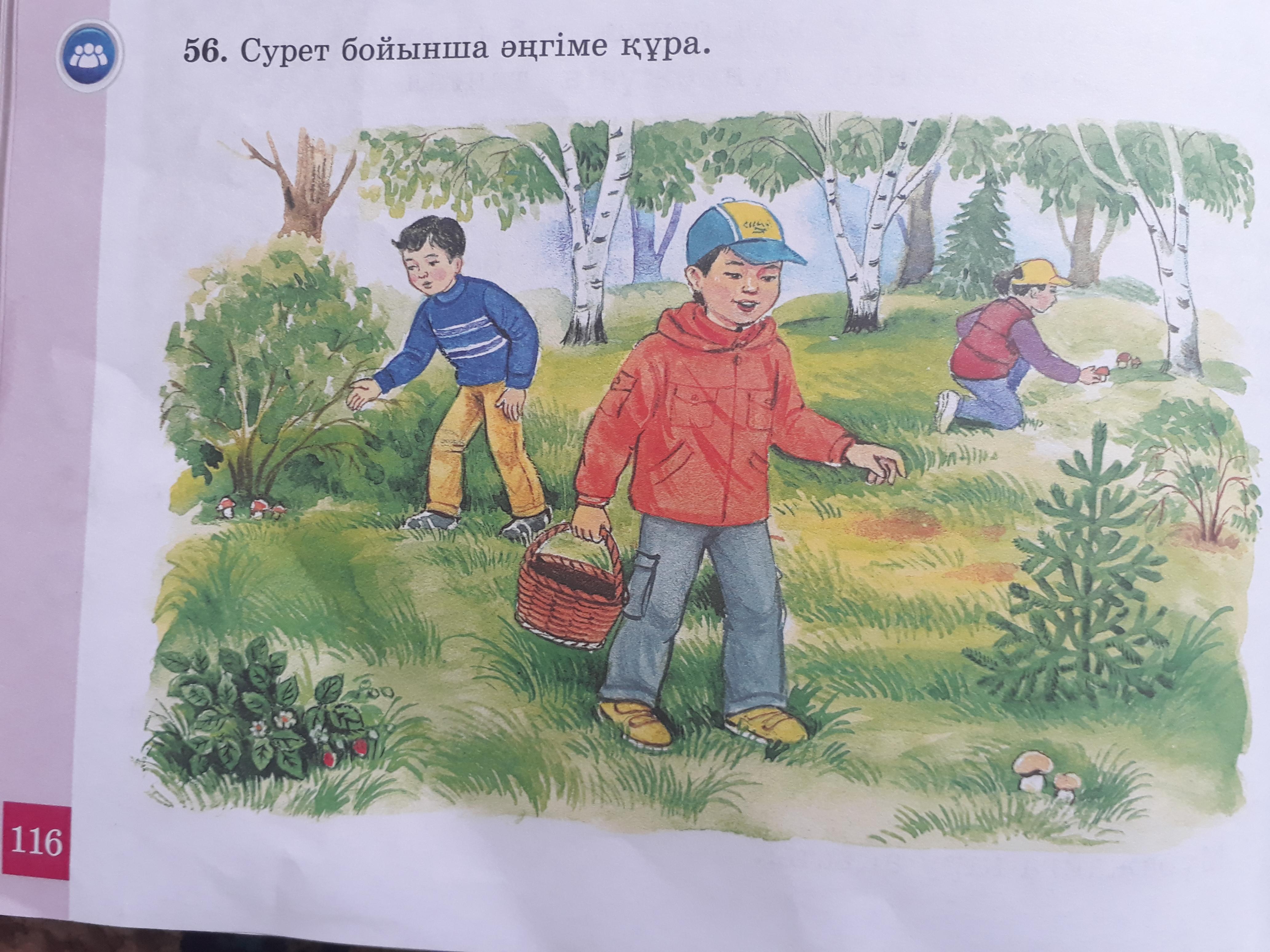 Асан мен Үсен мектептен келді.Екеуі Айданаға барды. Айдана сабақтан келіп далаға кетті. Үсен мен Асанды көрді. Сосын олар орманға барды. Саңырауқұлақтарды терді.жақсы Көңілмен үйлеріне кетті