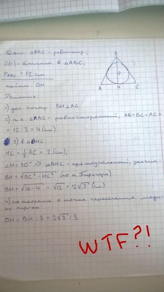 2) В равностороннем тр-ке центр вписанной и описанной окружности совпадают и есть точка О --точка пересечения медиан и все углы равны по 60 градусов