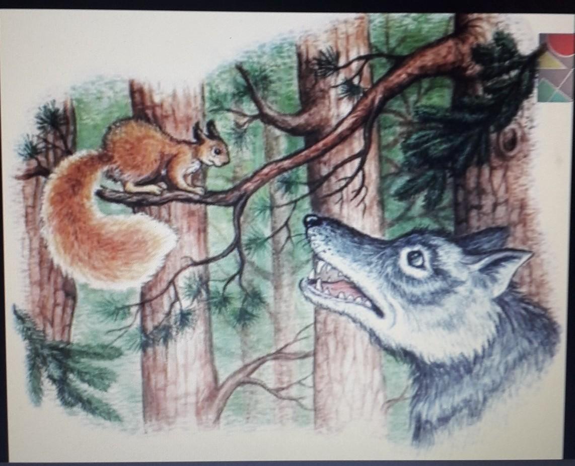 На данной картине изображены лесные животные: белка и волк. Волк — острозубый хищник, вероятно, заметивший маленького пушистого грызуна, а белка — шустрый и неугомонный любитель грибов и орехов. Дикие животные с любопытством наблюдают друг за другом, но грызун наверняка боится угрюмого санитара леса, поджимая свой рыжий хвост из-за плохого предчувствия. Ветки для животного этого вида всегда были и будут спасением от опасности, ведь когда в тернистой чаще появляется волк, всё вокруг замолкает.