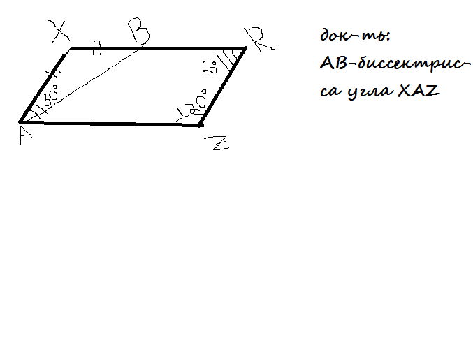 угол XAB=ABX,т.к АХ=ХВ--- угол АХВ=180-30-30=120,значит углы Х и Z равны и углы R и А тоже(360-120-120-60=60) ,т.е. угол А=60 и АВ-биссектриса этого угла,ведь ХАВ=30-половина угла А,ч.т.д.