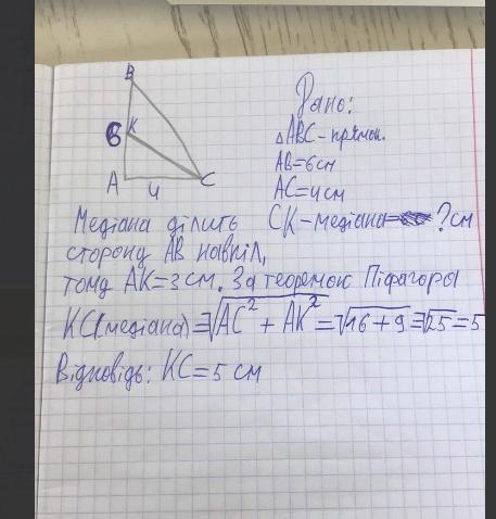 катети прямокутного трикутника 4 і 6 см знайдіть довжину медіани проведеної до бідьшого катета