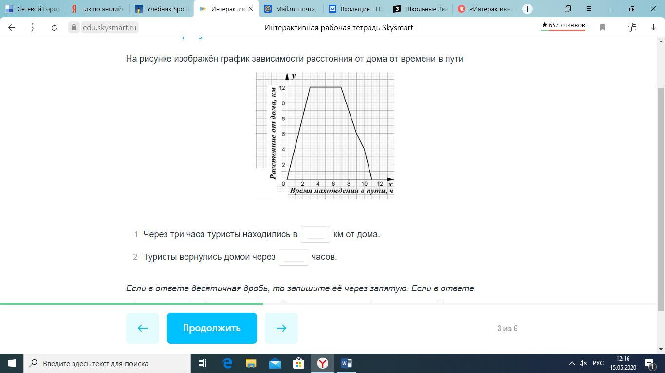 на рисунке изображен график зависимости расстояния до дома от времени пути. 1 Через три часа Туристы находились в ? км от дома.