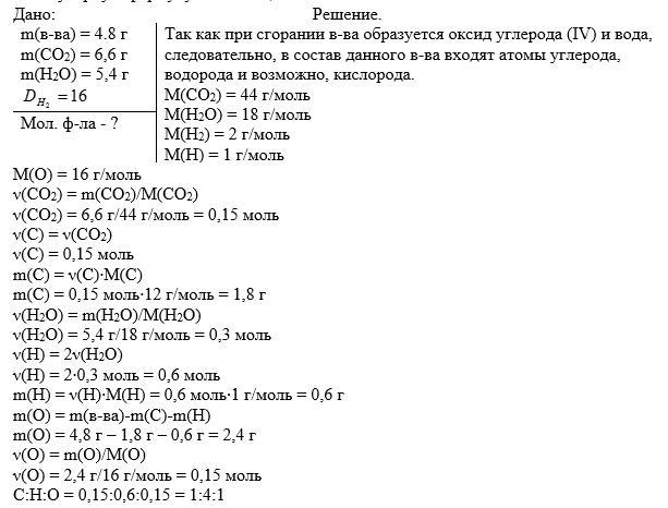 При сжигании органического вещества массой 4,8 г получено 6,6 г оксида углерода (IV) и 5,4 г воды. Относительная плотность этого вещества по водороду равна 16. Определить молекулярную формулу этого вещества.
