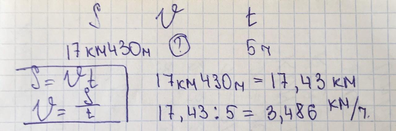 17,43 : 5 = 3,486 ≈ 3,5 км/ч