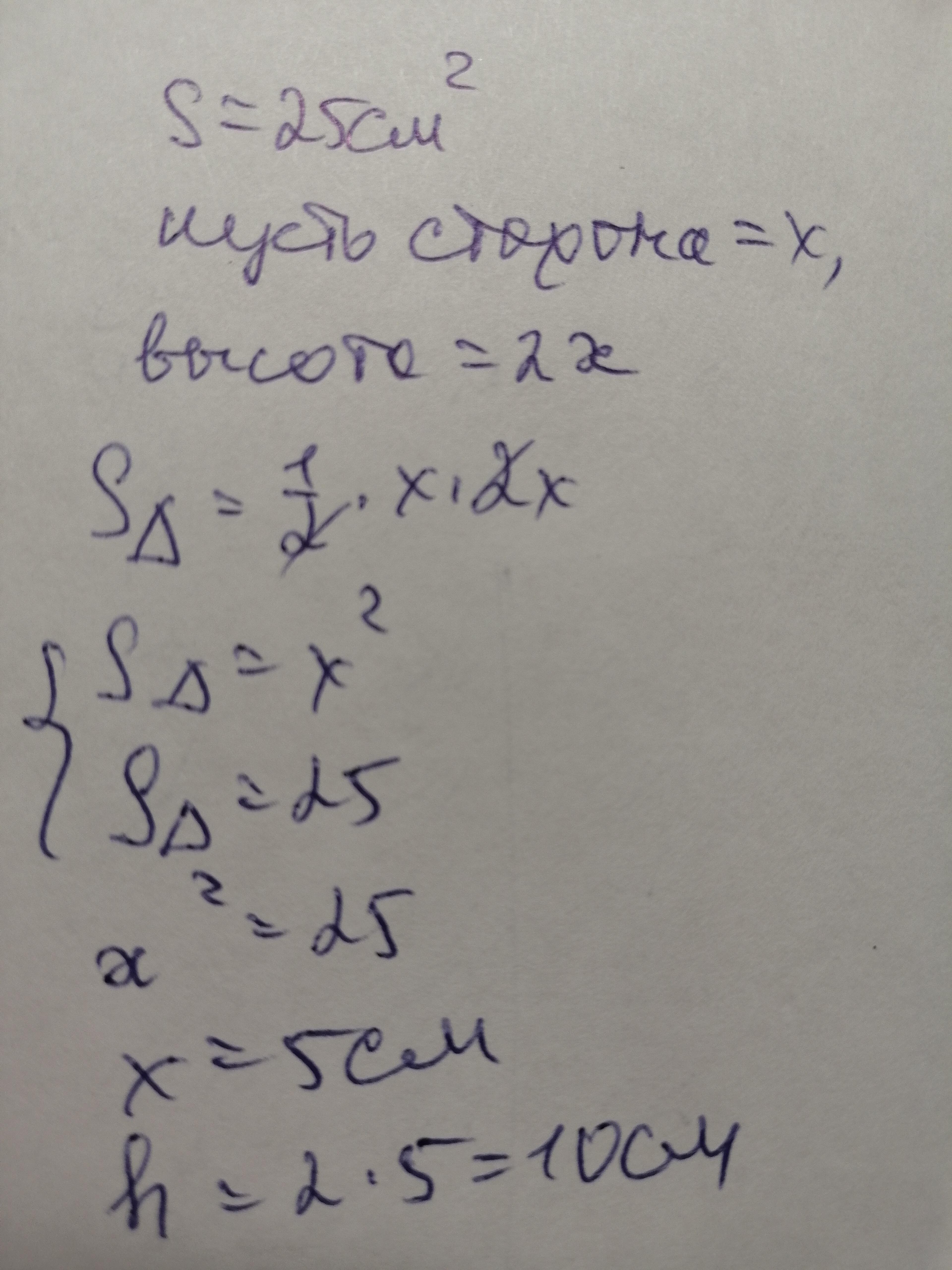Пожалуста помогитє єта срочно !!!!!!!!! площа трикутника дорівнює 25 см квадратних а висота вдвічі більша за сторону до якої вона проведена Знайдіть висоту