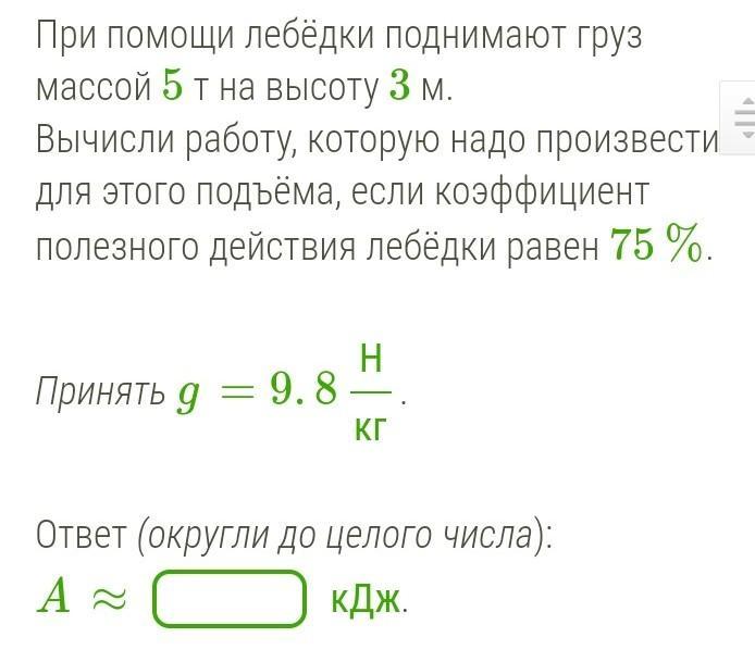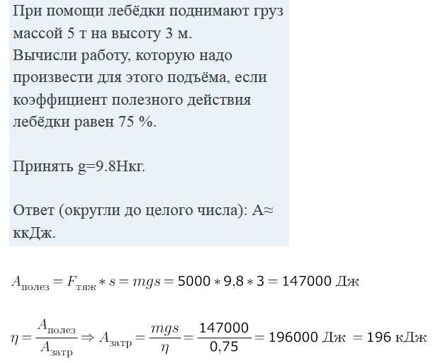 Вычисли работу, которую надо произвести для этого подъёма, если коэффициент полезного действия лебёдки равен 75 %.