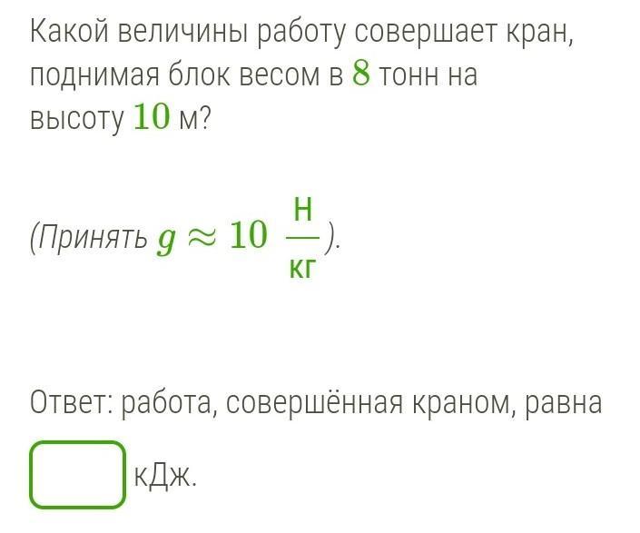 Какой величины работу совершает кран, поднимая блок весом в 8 тонн на высоту 10 м?