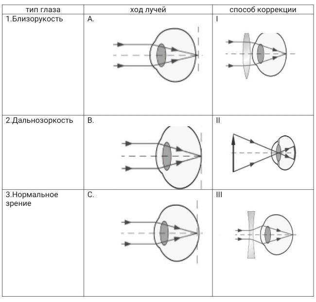 Установите соответствие между типом глаза,ходом лучей в них и способом коррекции изображений Заполните таблицу
