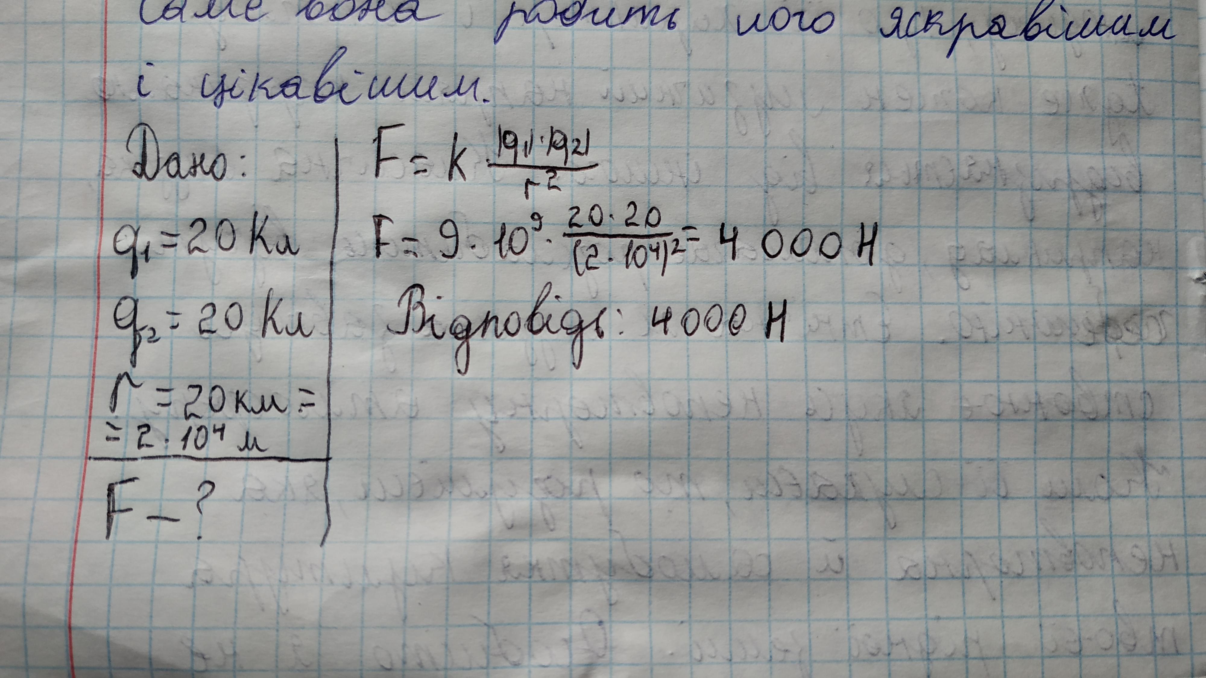 Середня відстань між двома хмарами 20 км. Електричні заряди їх відповідно дорівнюють 20 Кл і 20 Кл. З якою електричною силою взаємодіють хмари?