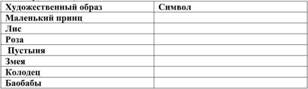 МАЛЕНЬКИЙ ПРИНЦ .Срочно, очень надо. Заполните таблицу, написав, символом чего являются слова левого столбика?