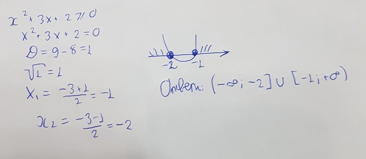 х²+3х+2=0 По Виету х=-1; х=-2. Решим неравенство (х+1)(х+2)≥0 методом интервалов. Разобьем на интервалы числовую прямую точками х=-2 и х=-1 и выясним знак на каждом из них.