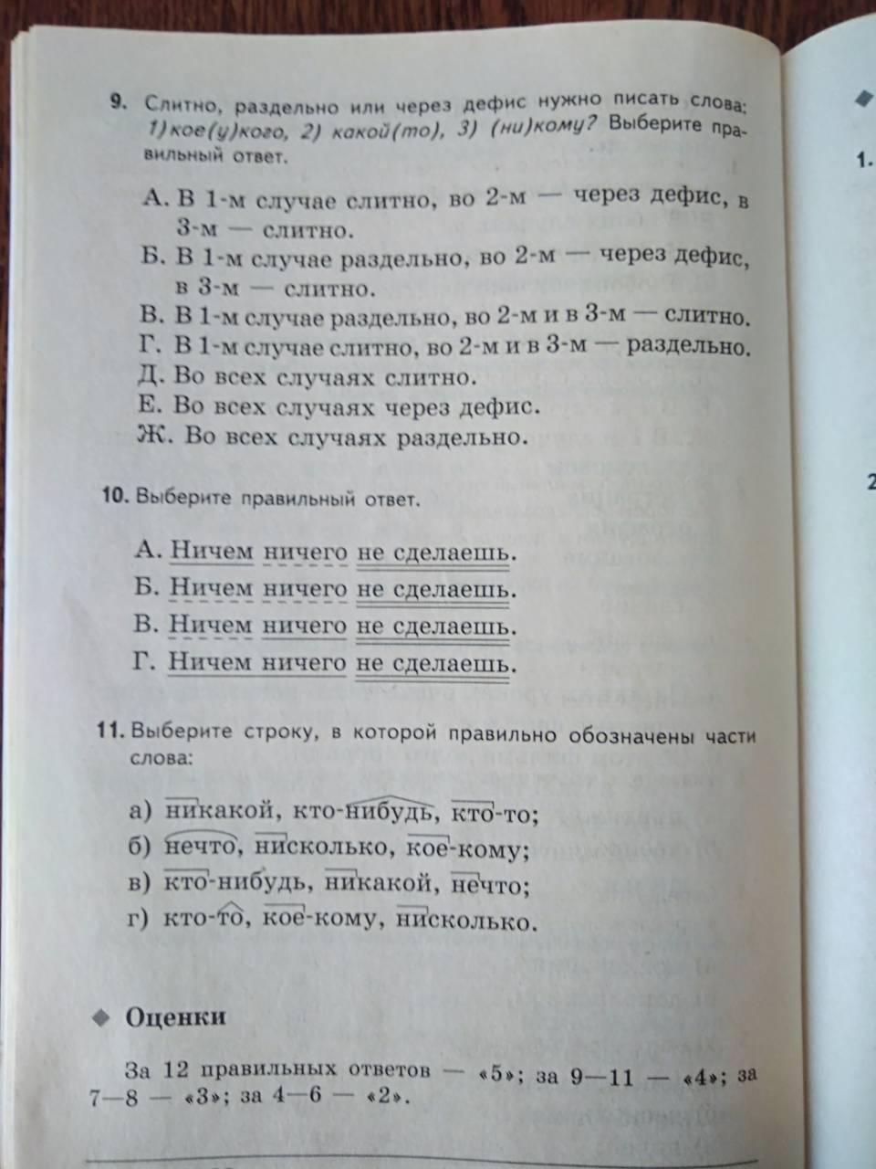 11. Г) кто-то(то -суффикс), кое-кому(кое -приставка), нисколько(ни- приставка).