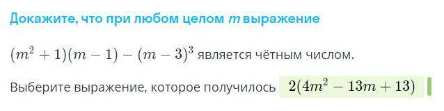 Докажите, что при любом целом m выражение (m^2+1)(m-1)-(m-3)^3(m 2 +1)(m−1)−(m−3) 3 является чётным числом. Выберите выражение, которое получилось(выбрать один вариант из картинки)