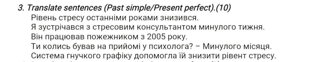 I met with a stress counselor last week. He has worked as a firefighter since 2005. Have you ever been to a psychologist's appointment? -Last month. A flexible schedule system has helped her reduce stress.