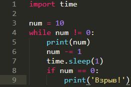 Напишите программу на Python, которая использует цикл «WHILE» для подсчета от 10 до 0 включительно. Затем напечатайте слова «Взрыв!» Используйте «пока» цикл вместо цикла «ЗА».