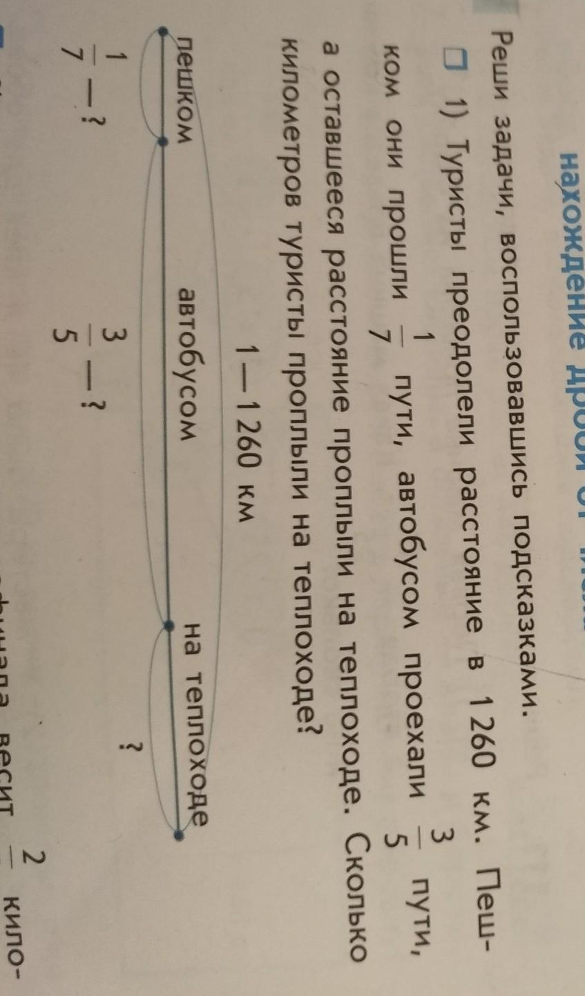 o 1) Туристы преодолели расстояние в 1260 км. Пешком 1/7;автобусом 3/5;а оставшиеся проплыли на теплоходе .сколько км проплыли теплоходом