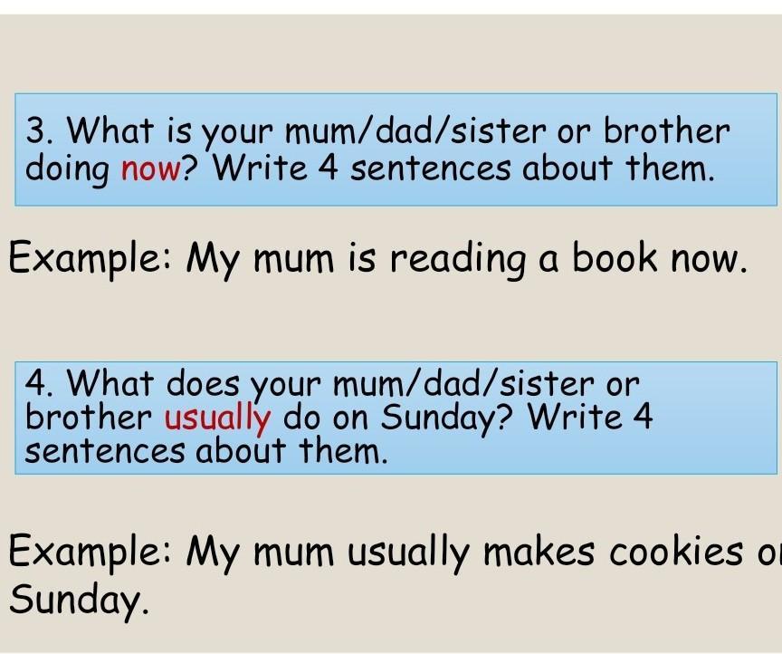 3. My mum is cooking a dinner now. My dad is working now. My brother is doing his homework now. My sister is going shopping now.