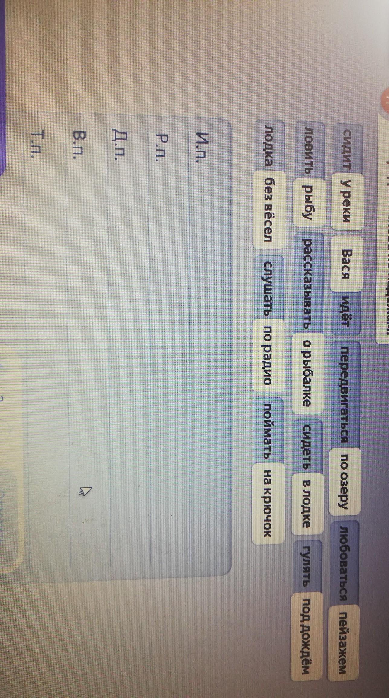 И.п лодка Вася Р.п у реки д.п по озеру в лодке т.п дождём пейзажем в.п рыбу п.п о рыбалке поймал крючок вроде в.п по радио д.п без весел не знаю