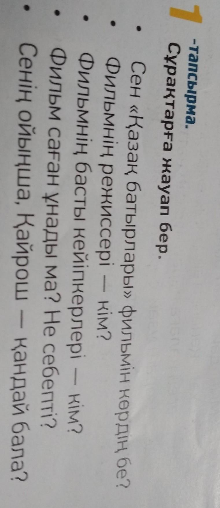 Ия көрдім. Ол фильмнің режиссеры Ғабит Махмұтұлы Мүсірепов. Басты кейіпкерлері ол Қайрош, Шеген, Бораш жане тагы баскалары. Ия өте ұнады. Өйткені ол ангиме оте кызыкты, фильмнин оте зор кызыгушылыгы бар жане тану туралы. Кайрош менин ойымша ол тек шыншылдықты, әділдік пен адалдықты қалайтын жауынгерлердің бірі.
