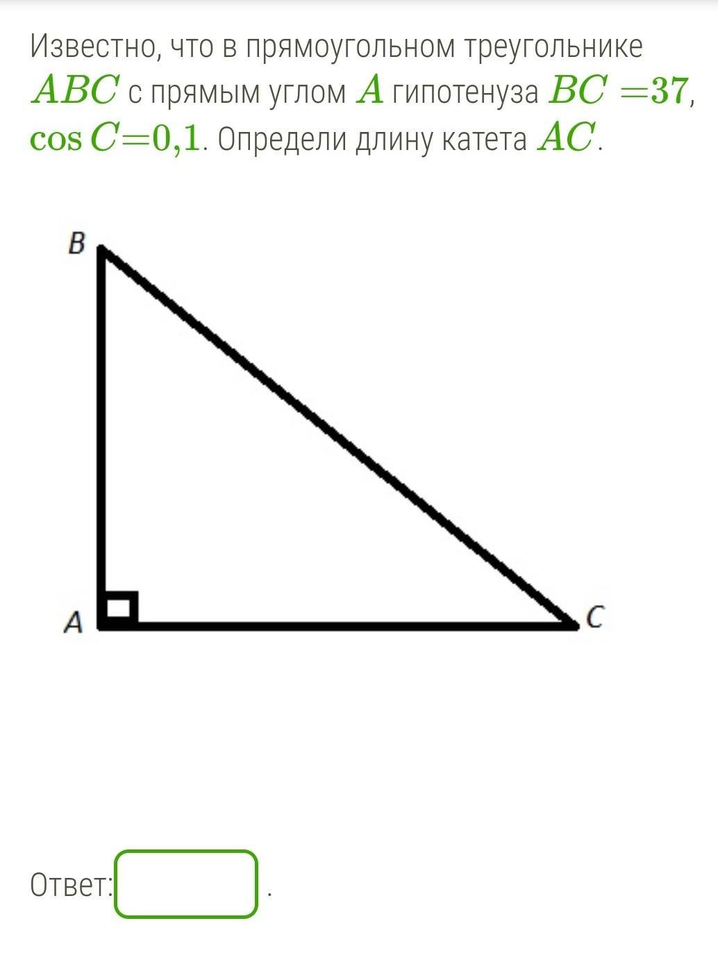 Известно, что в прямоугольном треугольнике ABC с прямым углом A гипотенуза BC=37, cosC=0,1. Определи длину катета AC.