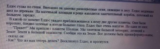 Елдос алаңда тұрған үлкен тәрелкеге ұқсас ғажайып кемені көрді.Одан екі ғаламшарлық түсті.Олардың бойы аласа,үлкен көзді.