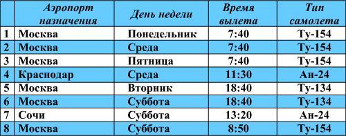 . База данных «Расписание самолетов» задана таблицей: