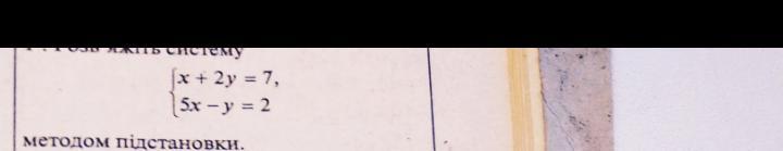 x+2y=7 и 5x-y=2 Тут нужно выразить x x = 7-2y теперь подставляем в 2 уравнение 5(7-2y)-y=2 получаем y=3 подставляем в x x=7-2*3 получаем x=3