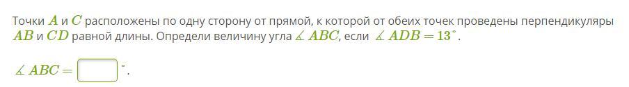 Точки A и C расположены по одну сторону от прямой, к которой от обеих точек проведены перпендикуляры AB и CD равной длины. Определи величину угла∡ABC, если ∡ADB = 13°.