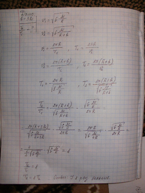 Искусственный спутник находится на круговой орбите на высоте h=3 R, где R- радиус Земли. Во сколько раз период вращениея спутника по ээтой орбите больше периода вращения по околоземной орбите
