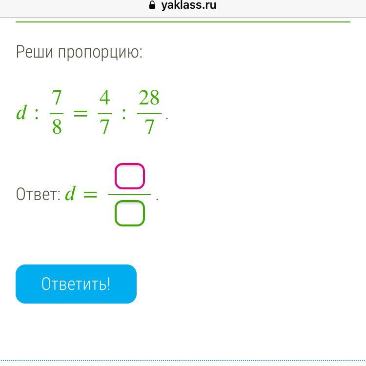 Ответ:d:\frac{7}{8} =\frac{4}{7}.\frac{7}{28} \\d:\frac{7}{8} =\frac{1}{7}\\ d=\frac{1}{7}.\frac{7}{8} \\d=\frac{7}{64}