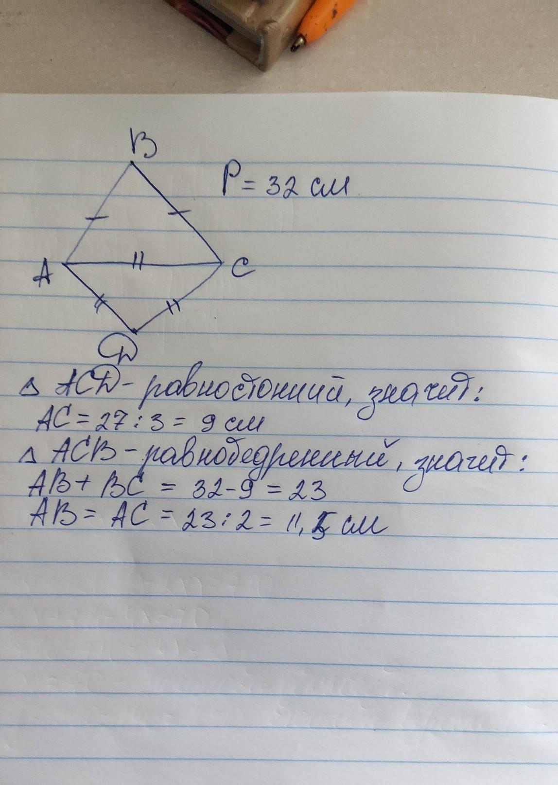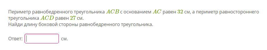 Периметр равнобедренного треугольника ACB с основанием AC равен 32 см, а периметр равностороннего треугольника ACD равен 27 см.