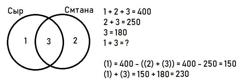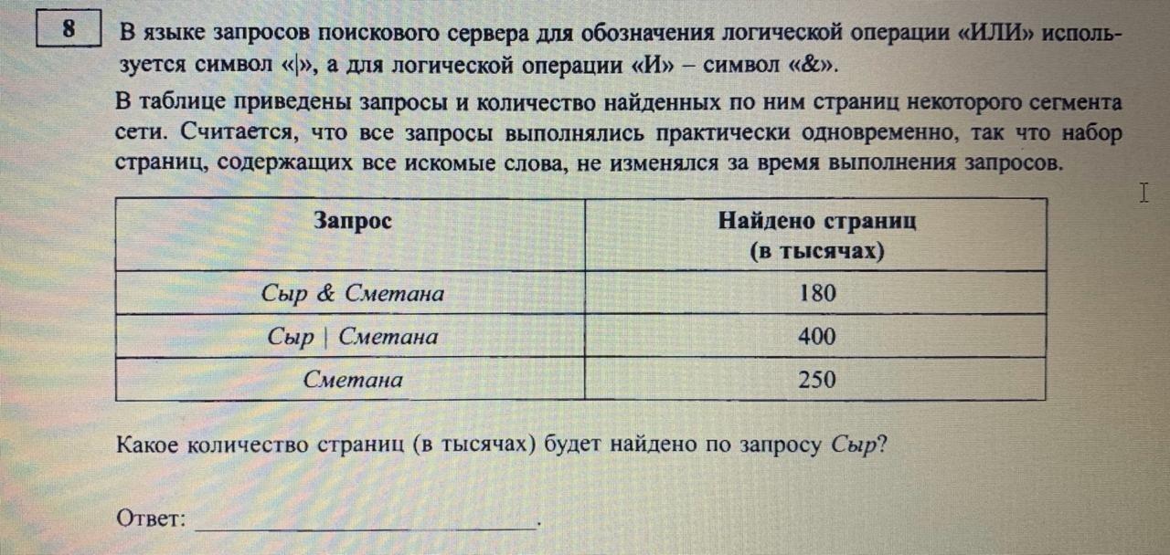 №8 Для решения задания будем использовать диаграмму Венна. Пусть Запрос "Сыр & Сметана" будет под цифрой 3, так как данная функция подразумевает поиск запросов, где присутствуют И Сметана, И Сыр; "Сыр | Сметана" под цифрами 1+2+3, так как данная функция подразумевает поиск запросов где присутствуют ИЛИ Сметана, ИЛИ Сыр, то есть все возможные результаты; "Сметана" под цифрами 2+3, так как данная функция подразумевает поиск запросов где присутствует ТОЛЬКО Сметана.