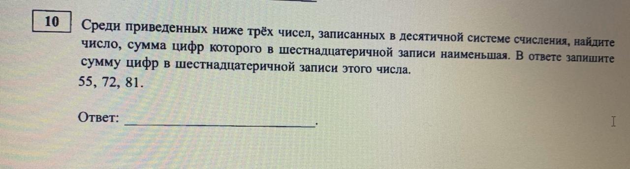Первое число: 55. Делим его на 16 и получаем 3 и остатке 7, в итоге 55 в десятичной равен 37 в шестнадцатиричной. Сумма цифр даёт ответ 10.