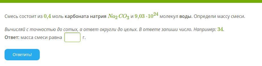Смесь состоит из 0,4 моль карбоната натрия Na2CO3 и 9,03 ⋅1024 молекул воды. Определи массу смеси.