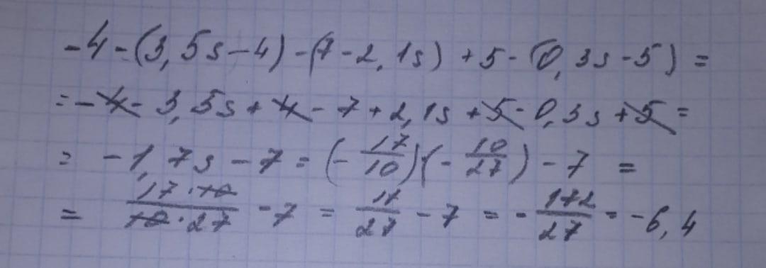 -4∙(3,5s -4)-(7 -2,1s) + 5∙(0,3s -5) и только потом вычислите его значение при s=-10/27