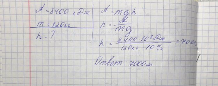 когда равномерно поднимают на платформу ящик массой 120 кг совершали работу равную 8400 кдж.Какова высота платформы.С решением пожалуйста!!!