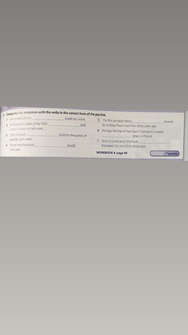 1) was stolen 2) had been sold 3) is visited 4) will be built 5) was invented 6) will be played 7) has been translated