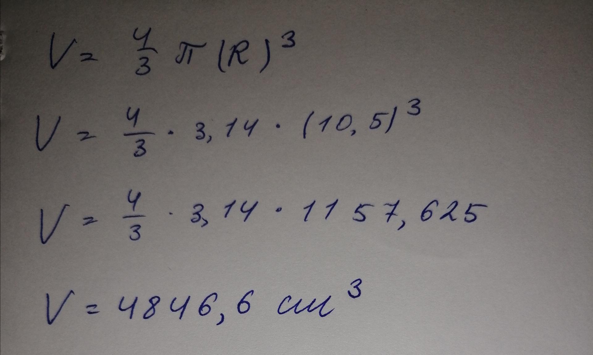 Радиус шара равен 10,5 см. Значение числа π≈3,14.