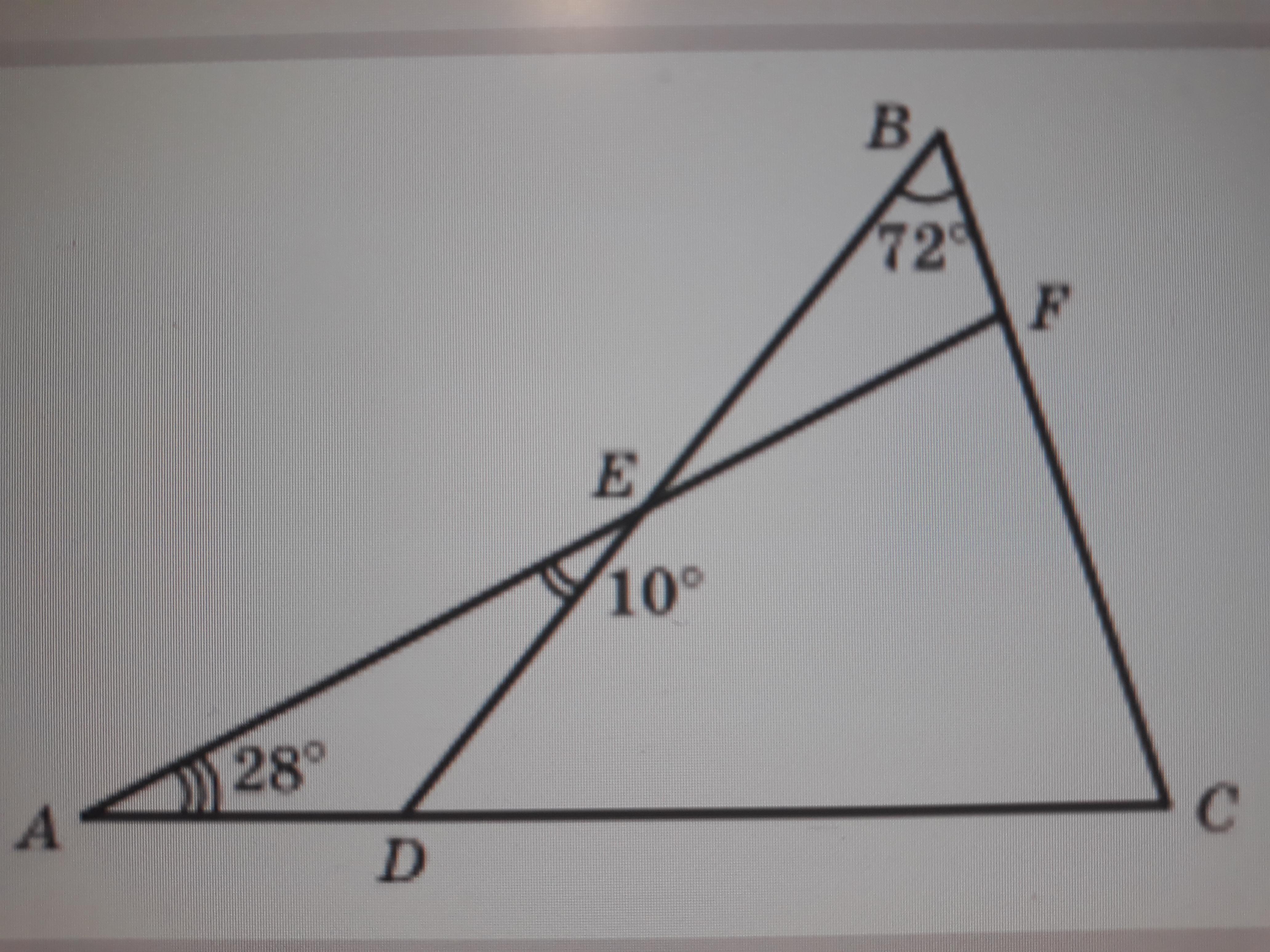 Угол вертикальный углу E равен 10⁰, как вертикальные. Значит угол F в тр. EBF = 180 - 82 = 98⁰, а угол смежный с углом F равен 180-98 = 82⁰