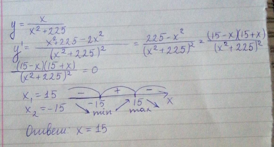 Критических точек у этой производной не будет, т. к. (х² + 225)² > 0 при любых х, стационарные точки – х = -15, х = 15. Отмечаем их на координатной прямой, обозначаем интервалы, подставляем значения из каждого интервала в производную, чтобы определить её знак на них, и уже исходя из знаков ( "-" – убывание, "+" – возрастание) определяем, убывает или возрастает сама функция. Та точка, в которой возрастание сменяется убыванием, и будем максимумом функции.