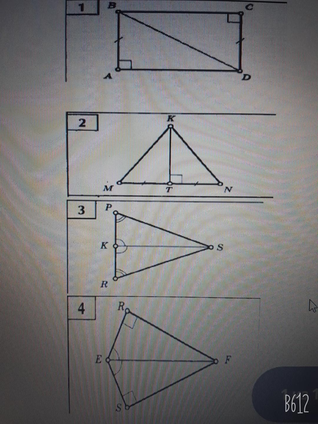Нужно решить проверочную по геометрии за 7 класс. Нужно доказать равенство треугольников. Подробно!!! Всего 4 задачи. Заранее благодарю за ответ.