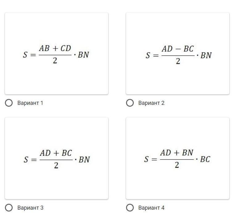 Оберіть правильний варіант формули обчислення площі трапеції, основи якої AD, BC, а висота ВN