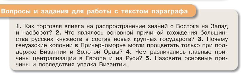 Китай считался монополистом в сфере продажи шелка, фарфора и чая. В разных странах эти товары обменивались на лук, морковь, виноград и другие продукты, которые Восток доселе не знал. Шелковый путь дал возможность узнать Западу восточные учения. Из-за этого ислам и буддизм распространились на Ближнем Востоке. Европа, благодаря Шелковому пути, узнала о далеких, неизведанных для нее землях. 2)Большинство русских княжеств входило в состав новых крупных государств по ряду причин. Им нужна была безопасность от врагов, как половцы или ордынцы. Присоединение к другим государствам давало возможность торговать и налаживать культурные связи. Вместе с тем была отличная возможность расширять свои княжества с помощью завоевания земель.