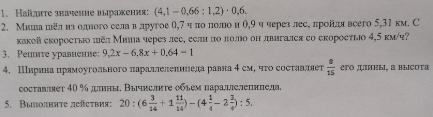 2. 1) 4,5*0,7=3,15(км) прошел по полю 2) 5,31-3,15=2,16(км) прошел через лес 3) 2,16:0,9=2,4(км/час) скорость Миши через лес Ответ: Миша шел по лесу со скоростью 2,4(км/час)